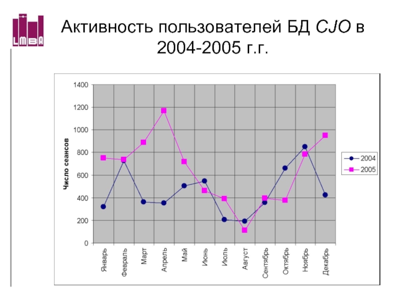 Слайд 66Активность пользователей БД CJO в 2004-2005 г.г.