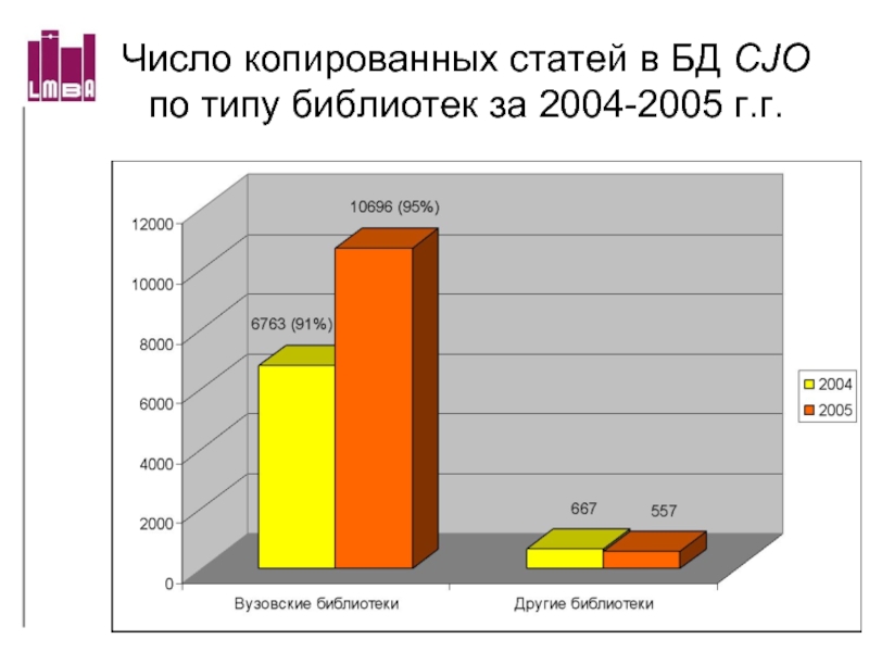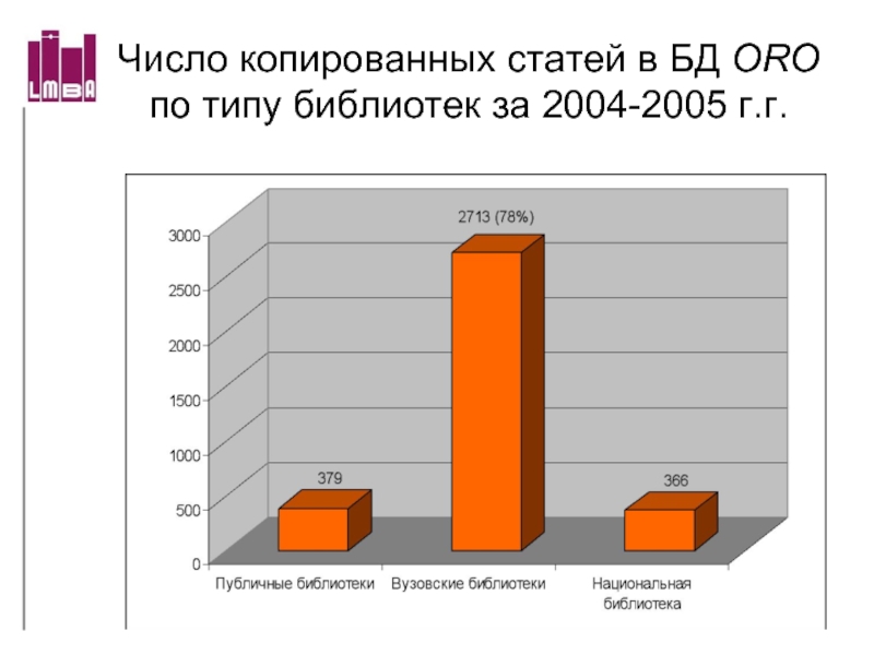Слайд 68Число копированных статей в БД ORO по типу библиотек за 2004-2005