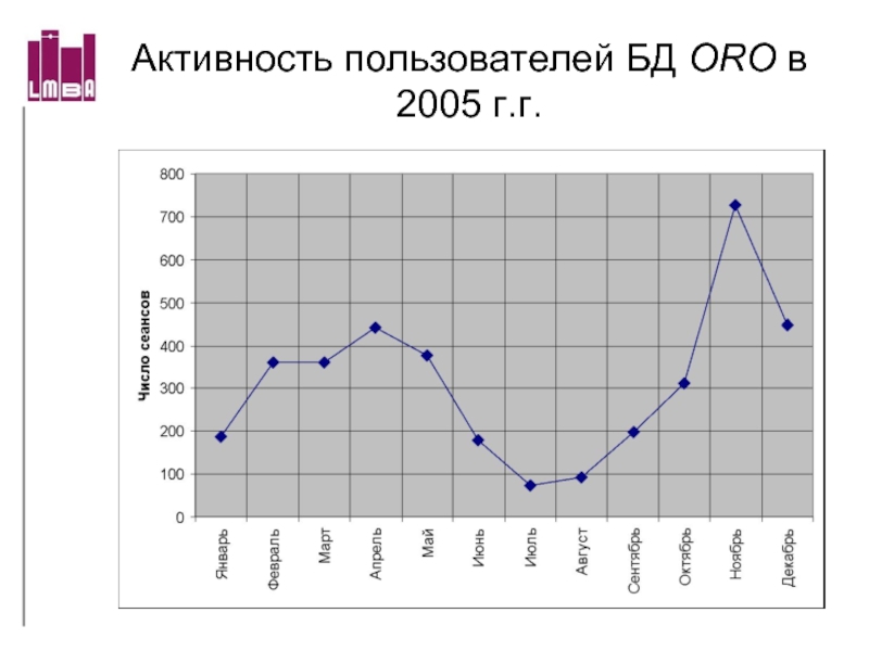 Слайд 69Активность пользователей БД ORO в 2005 г.г.