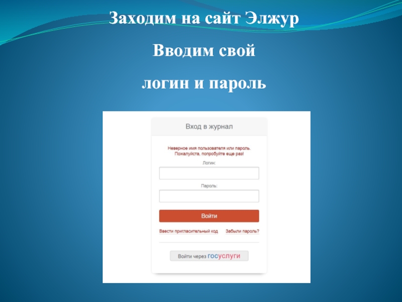 Слайд 9 Заходим на сайт Элжур Вводим свой логин и пароль