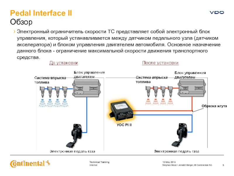 Электронный ограничитель скорости ТС представляет собой электронный блок управления, который устанавливается между датчиком педального узла (датчиком акселератора) и блоком управления двигателем автомобиля. Основное назначение данного блока - ограничение максимальной скорости движения транспортного средства.