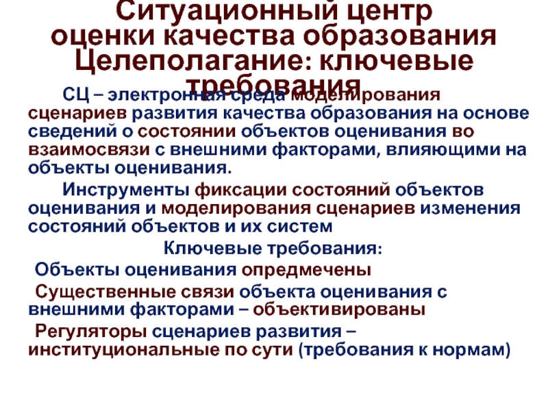 сценариев развития качества образования на основе сведений о состоянии объектов оценивания во взаимосвязи с внешними факторами, влияющими на объекты оценивания.