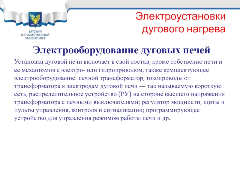 собственно печи и ее механизмов с электро- или гидроприводом, также комплектующее электрооборудование: печной трансформатор, токопроводы от трансформатора к электродам дуговой печи — так называемую короткую сеть, распределительное устройство (РУ) на стороне высшего напряжения трансформатора с печными выключателями; регулятор мощности; щиты и пульты управления, контроля и сигнализации; программирующее устройство для управления режимом работы печи и др.