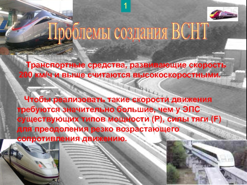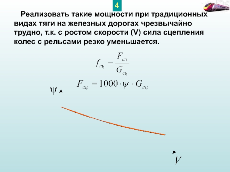 Чтобы реализовать такие скорости движения требуются значительно большие, чем у ЭПС существующих типов мощности (P), cилы тяги (F) для преодоления резко возрастающего сопротивления движению.