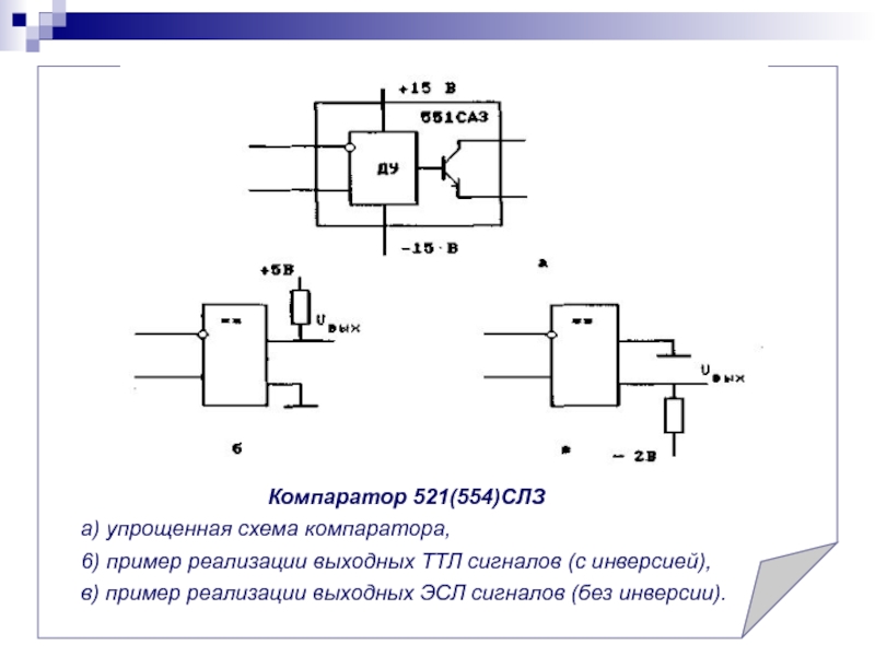 Его особенностью является весьма своеобразный выходной каскад. Этот каскад имеет открытый коллектор и открытый эмиттер, и возможна реализация различных включений выходного каскада (инвертирующего и неинвертирующего) при различных комбинациях величин положительного и отрицательного напряжений питания