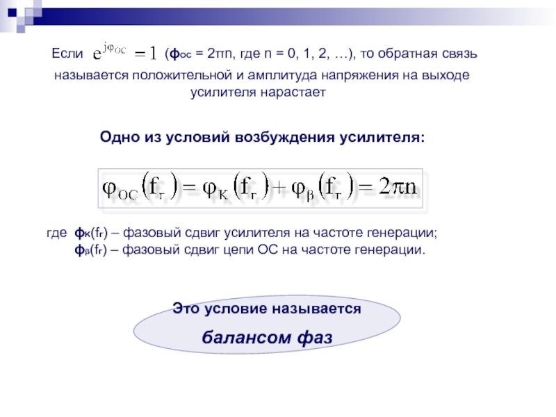 При выполнении этого условия амплитуда напряжения на выходе усилителя увеличивается.