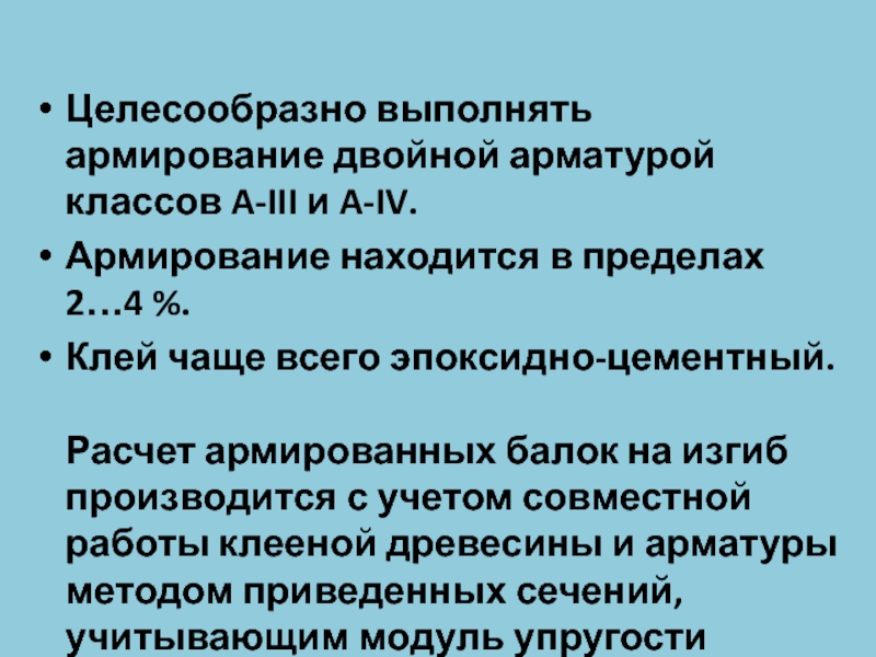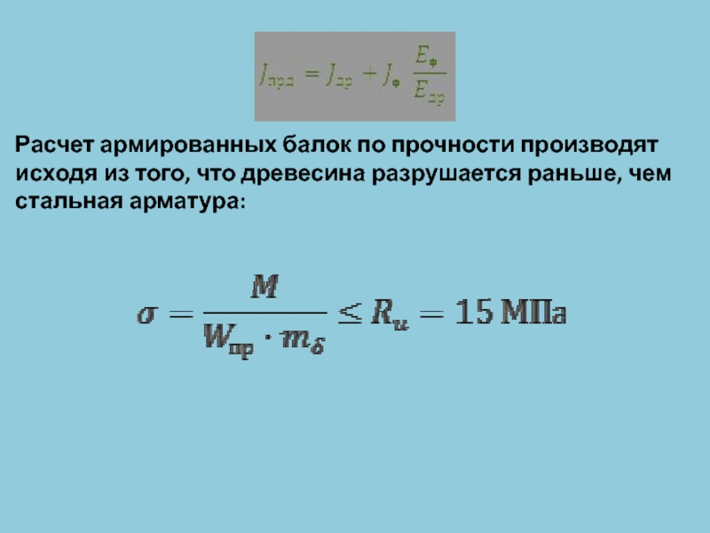 Слайд 36Расчет армированных балок по прочности производят исходя из того, что древесина