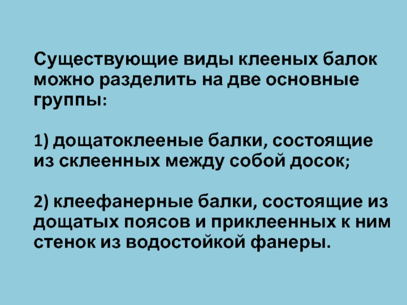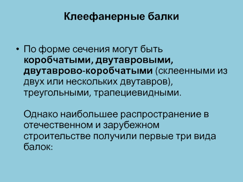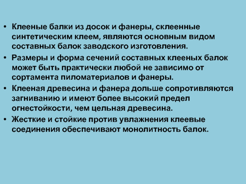 Слайд 2Клееные балки из досок и фанеры, склеенные синтетическим клеем, являются основным