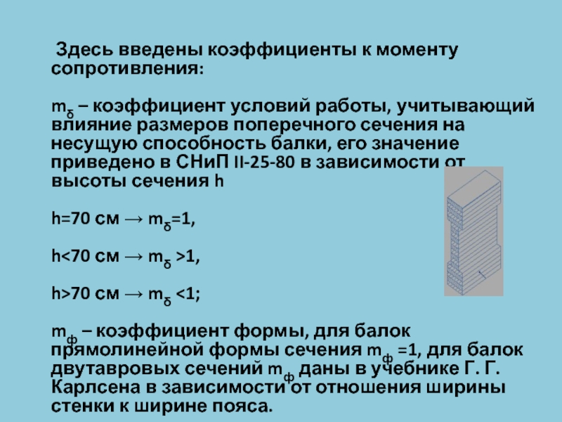 условий работы, учитывающий влияние размеров поперечного сечения на несущую способность балки, его значение приведено в СНиП II-25-80 в зависимости от высоты сечения h