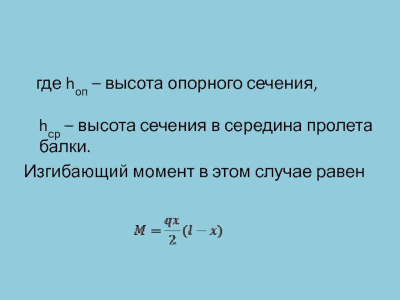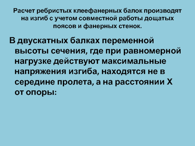 В двускатных балках переменной высоты сечения, где при равномерной нагрузке действуют максимальные напряжения изгиба, находятся не в середине пролета, а на расстоянии Х от опоры:
