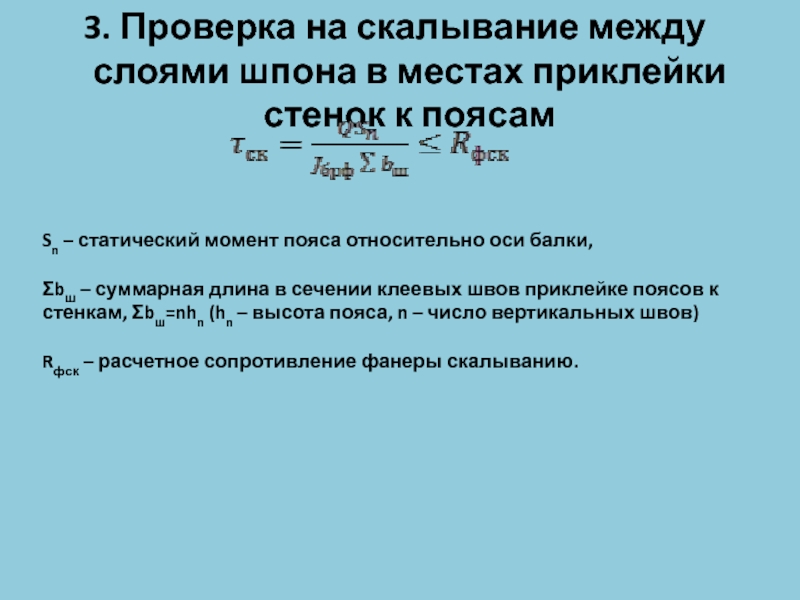 Σbш – суммарная длина в сечении клеевых швов приклейке поясов к стенкам, Σbш=nhn (hn – высота пояса, n – число вертикальных швов)