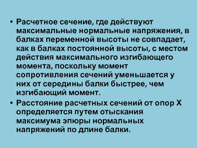 Слайд 20Расчетное сечение, где действуют максимальные нормальные напряжения, в балках переменной высоты
