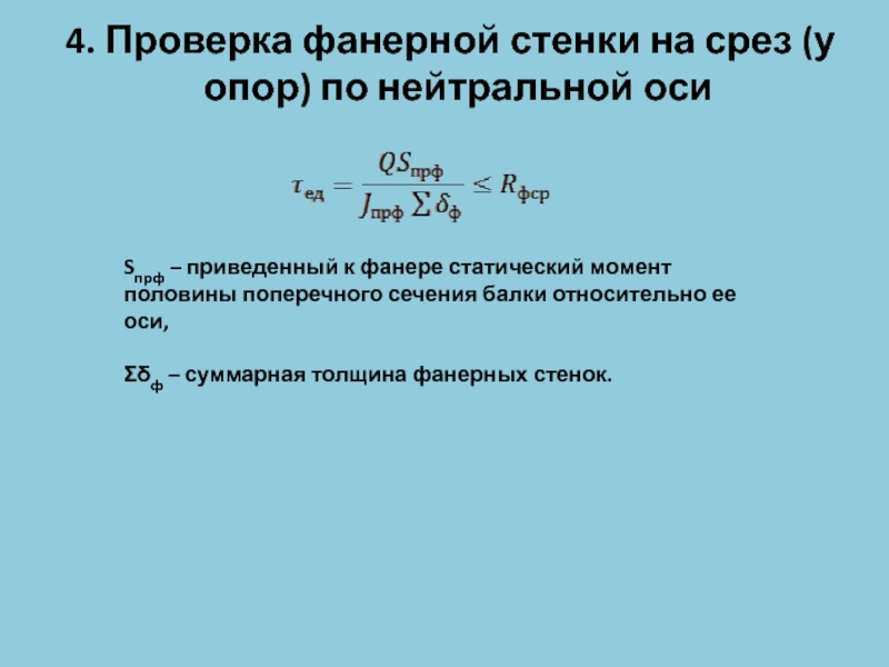 Слайд 57 4. Проверка фанерной стенки на срез (у опор) по нейтральной