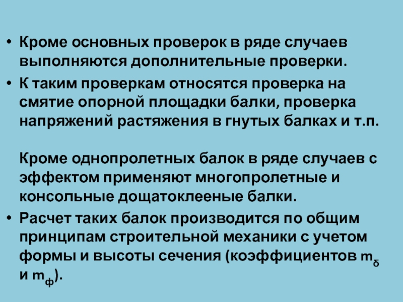 Слайд 18При расчете дощатоклееных балок выполняют следующие проверки.
