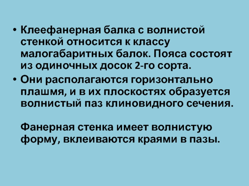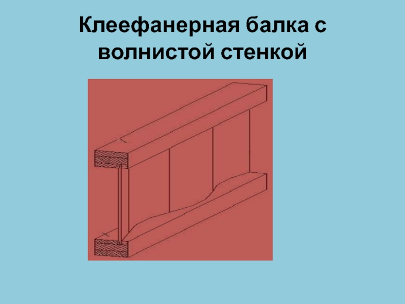 Слайд 62Клеефанерная балка с волнистой стенкой относится к классу малогабаритных балок. Пояса