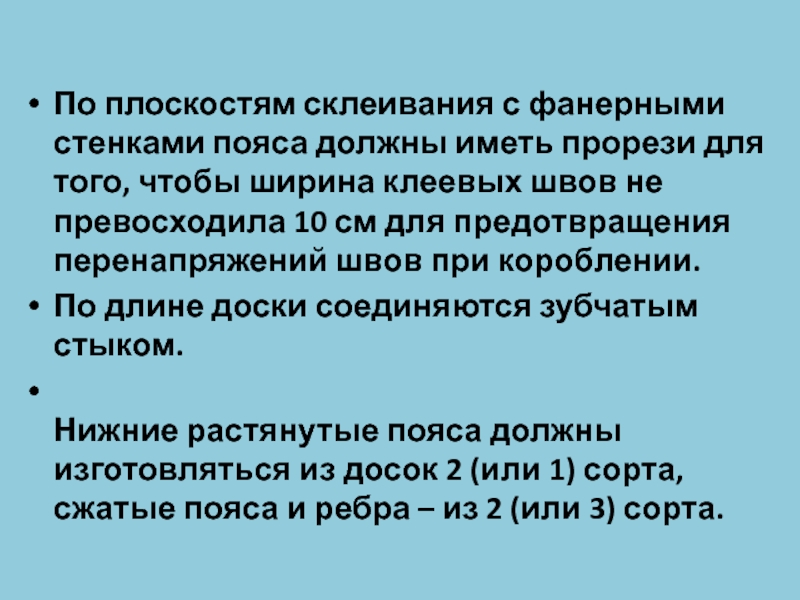 Слайд 46По плоскостям склеивания с фанерными стенками пояса должны иметь прорези для