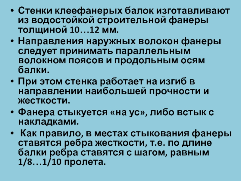 Слайд 44Стенки клеефанерых балок изготавливают из водостойкой строительной фанеры толщиной 10…12 мм.