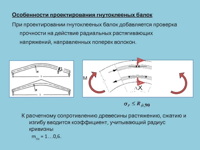 К расчетному сопротивлению древесины растяжению, сжатию и изгибу вводится коэффициент, учитывающий радиус кривизны