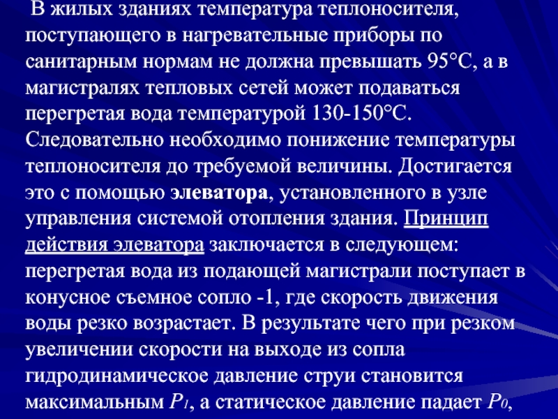 санитарным нормам не должна превышать 95°С, а в магистралях тепловых сетей может подаваться перегретая вода температурой 130-150°С. Следовательно необходимо понижение температуры теплоносителя до требуемой величины. Достигается это с помощью элеватора, установленного в узле управления системой отопления здания. Принцип действия элеватора заключается в следующем: перегретая вода из подающей магистрали поступает в конусное съемное сопло -1, где скорость движения воды резко возрастает. В результате чего при резком увеличении скорости на выходе из сопла гидродинамическое давление струи становится максимальным Р1, а статическое давление падает Р0,