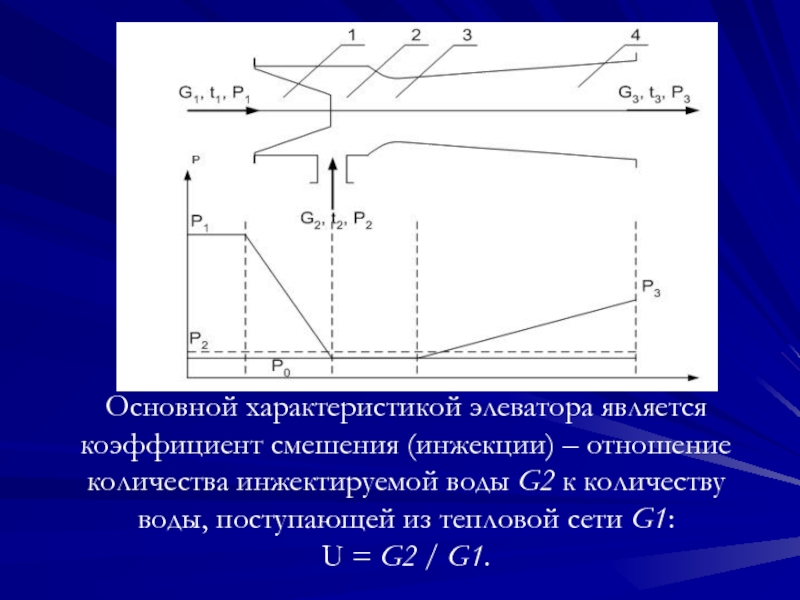 Слайд 7Основной характеристикой элеватора является коэффициент смешения (инжекции) – отношение количества инжектируемой