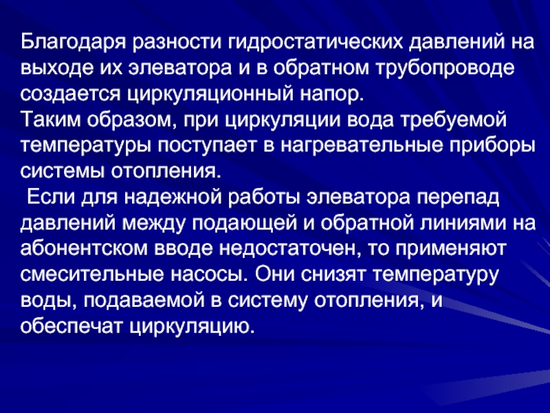 Если для надежной работы элеватора перепад давлений между подающей и обратной линиями на абонентском вводе недостаточен, то применяют смесительные насосы. Они снизят температуру воды, подаваемой в систему отопления, и обеспечат циркуляцию.
