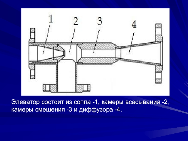 Слайд 3Элеватор состоит из сопла -1, камеры всасывания -2, камеры смешения -3