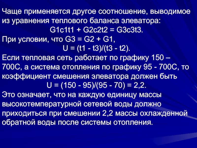 Слайд 8Чаще применяется другое соотношение, выводимое из уравнения теплового баланса элеватора: