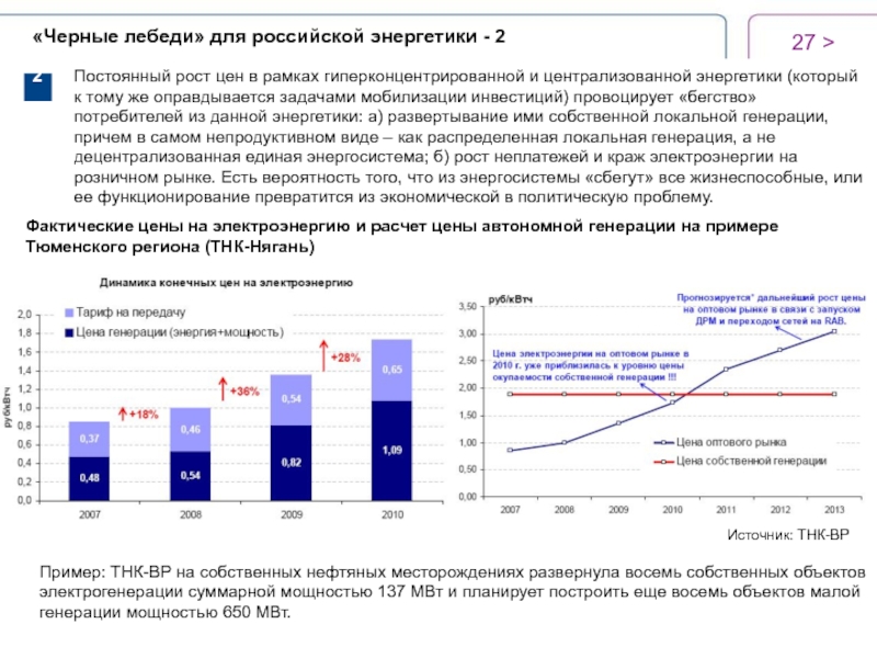 Пример: ТНК-BP на собственных нефтяных месторождениях развернула восемь собственных объектов электрогенерации суммарной мощностью 137 МВт и планирует построить еще восемь объектов малой генерации мощностью 650 МВт.