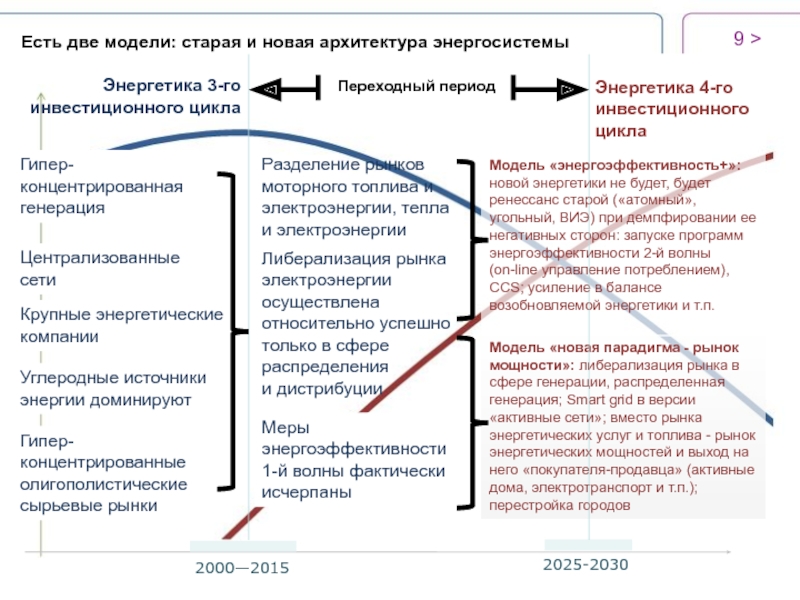 Модель «новая парадигма - рынок мощности»: либерализация рынка в сфере генерации, распределенная генерация; Smart grid в версии «активные сети»; вместо рынка энергетических услуг и топлива - рынок энергетических мощностей и выход на него «покупателя-продавца» (активные дома, электротранспорт и т.п.); перестройка городов