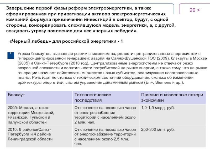 Угроза блэкаутов, вызванная резким снижением надежности централизованных энергосистем с гиперконцентрированной генерацией: авария на Саяно-Шушенской ГЭС (2009), блэкауты в Москве (2005) и Санкт-Петербурге (2010 год). Централизованные энергосистемы не отвечают резко возросшей сложности и волатильности потребителей на рынке энергии, а также тому, что на рынке генерации начинает действовать множество новых субъектов, реализующие несогласованные планы. Речь идет не столько о техническом состоянии оборудования, сколько об изменении архитектуры энергетики, систем управления динамичным рынком (En+, Siemens и др.).
