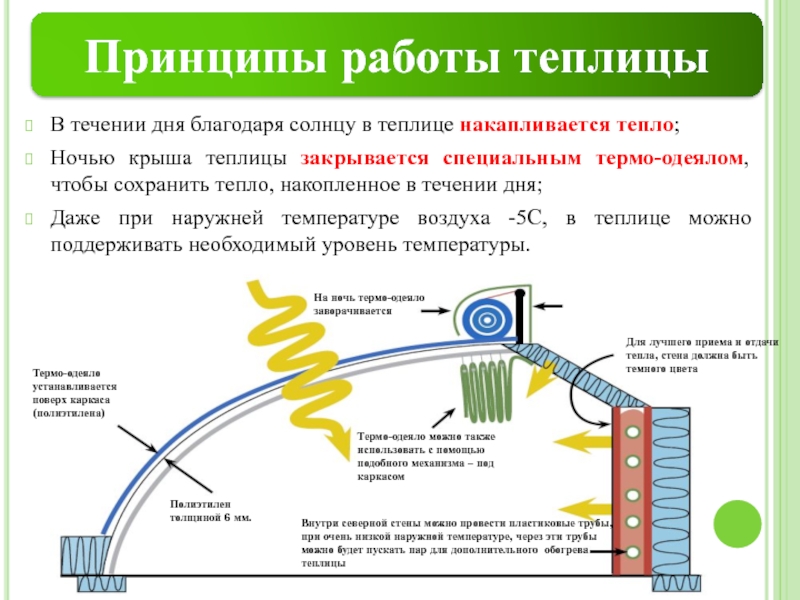 При наружной температуре воздуха до -5C нет необходимости в обогреве теплицы специальными устройствами (электричество/ газ/ дизель/ уголь)!