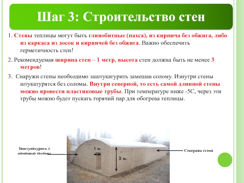 Строить такие теплицы легко и недорого: используются технологии, которые применяли еще наши предки – глинобитная стена (пахса), кирпичи из глины без обжига (собственного производства), каркас из досок и кирпичи без обжига.