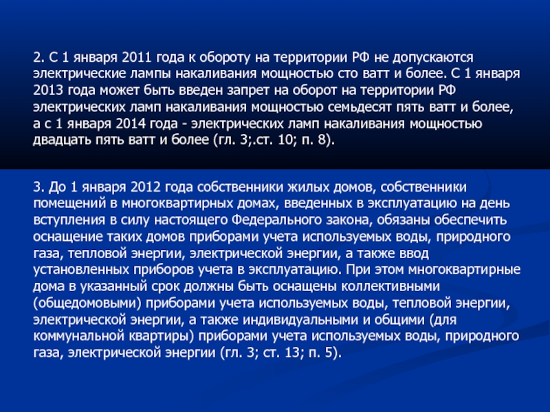2. С 1 января 2011 года к обороту на территории РФ не допускаются электрические лампы накаливания мощностью сто ватт и более. С 1 января 2013 года может быть введен запрет на оборот на территории РФ электрических ламп накаливания мощностью семьдесят пять ватт и более, а с 1 января 2014 года - электрических ламп накаливания мощностью двадцать пять ватт и более (гл. 3;.ст. 10; п. 8).