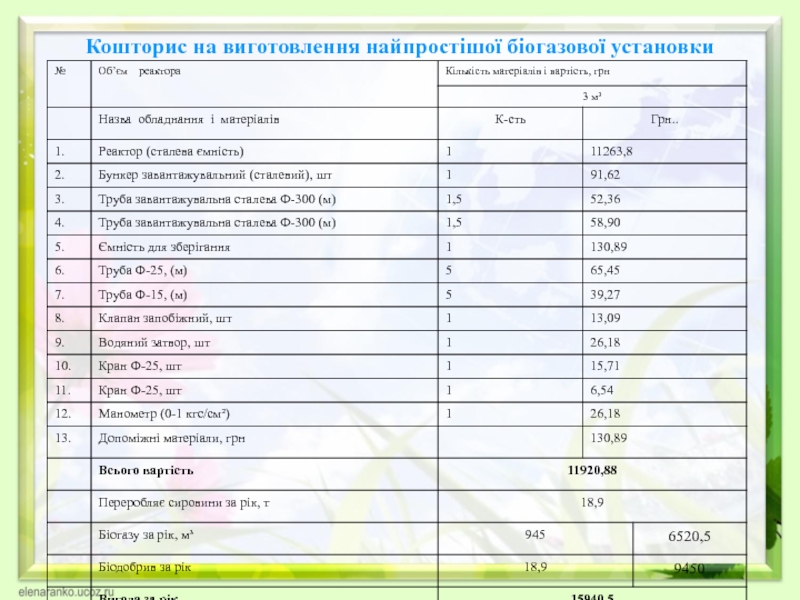 - Розрахувати економічний ефект від запровадження біогазової установки.