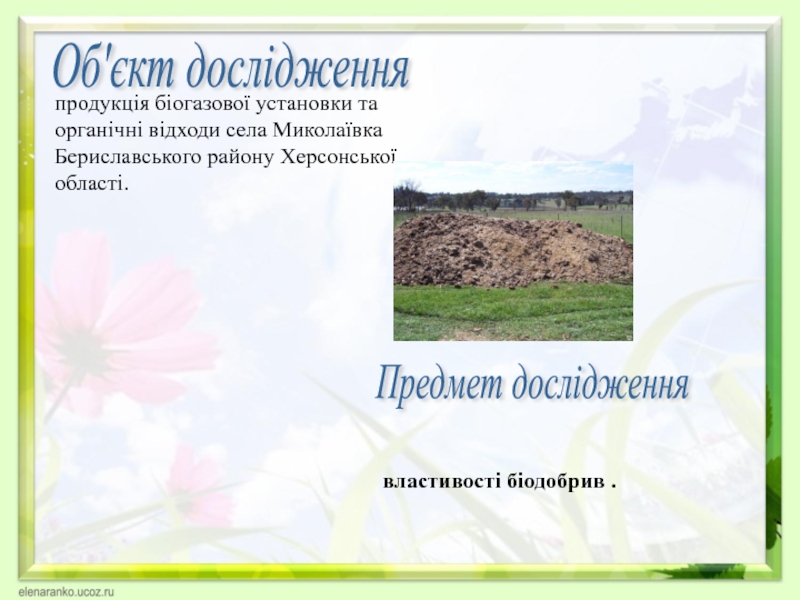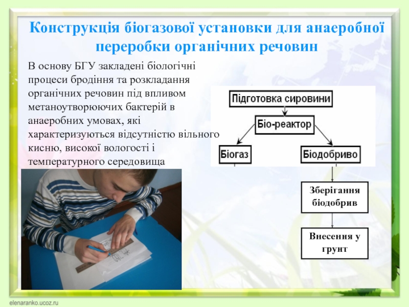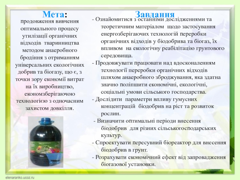 - Ознайомитися з останніми дослідженнями та теоретичним матеріалом щодо застосування енергозберігаючих технологій переробки органічних відходів у біодобрива та біогаз, їх впливом на екологічну реабілітацію грунтового середовища.