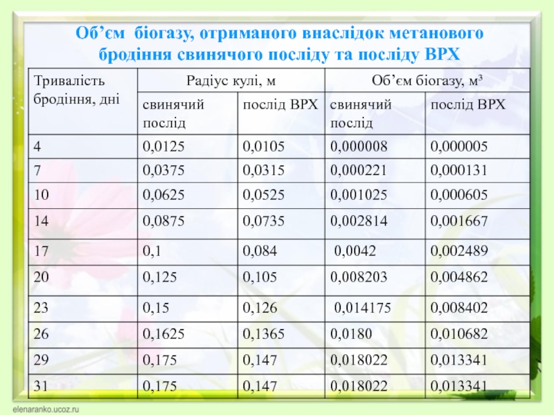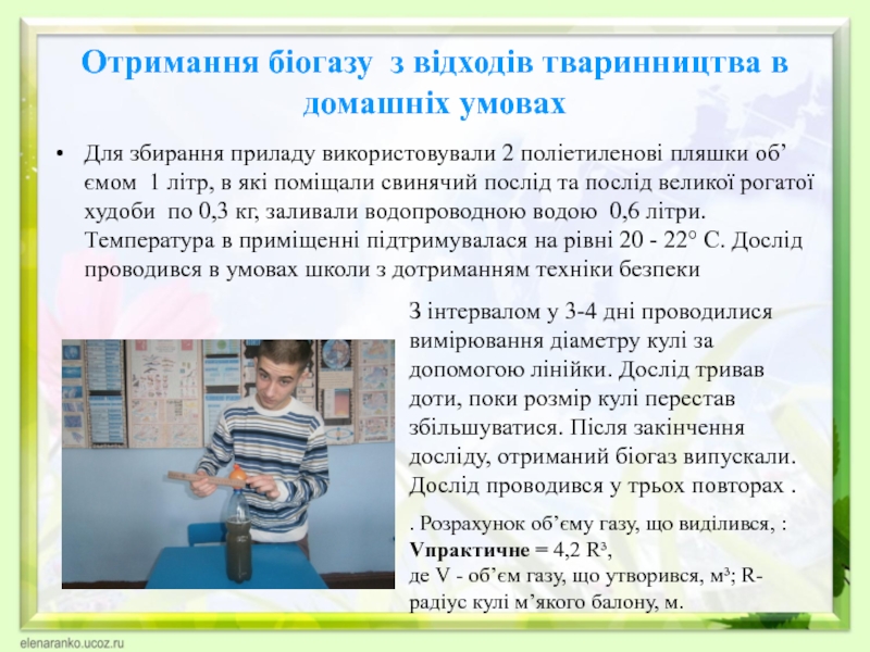 З інтервалом у 3-4 дні проводилися вимірювання діаметру кулі за допомогою лінійки. Дослід тривав доти, поки розмір кулі перестав збільшуватися. Після закінчення досліду, отриманий біогаз випускали. Дослід проводився у трьох повторах .