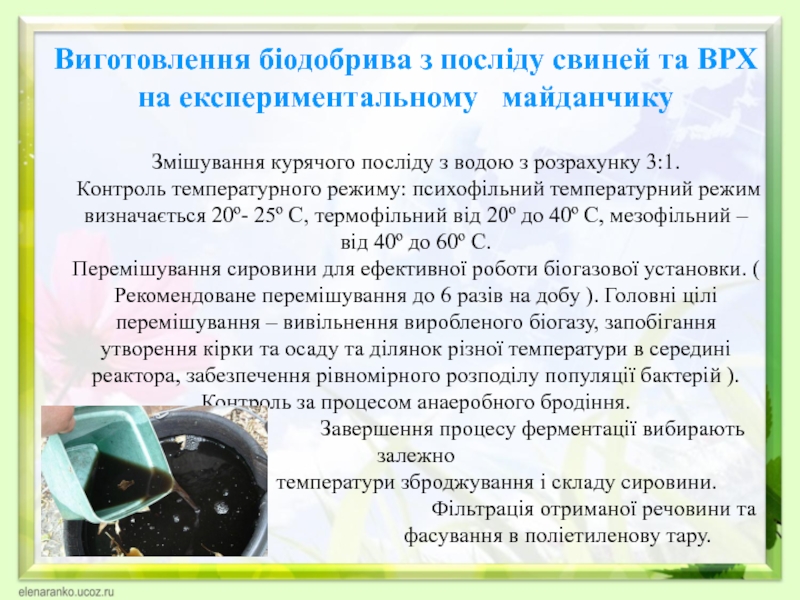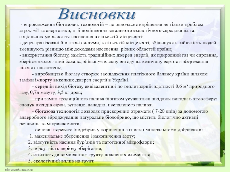 - Продовжувати працювати над вдосконаленням технології переробки органічних відходів шляхом анаеробного зброджування, яка здатна значно поліпшити економічні, екологічні, соціальні умови сільського господарства.