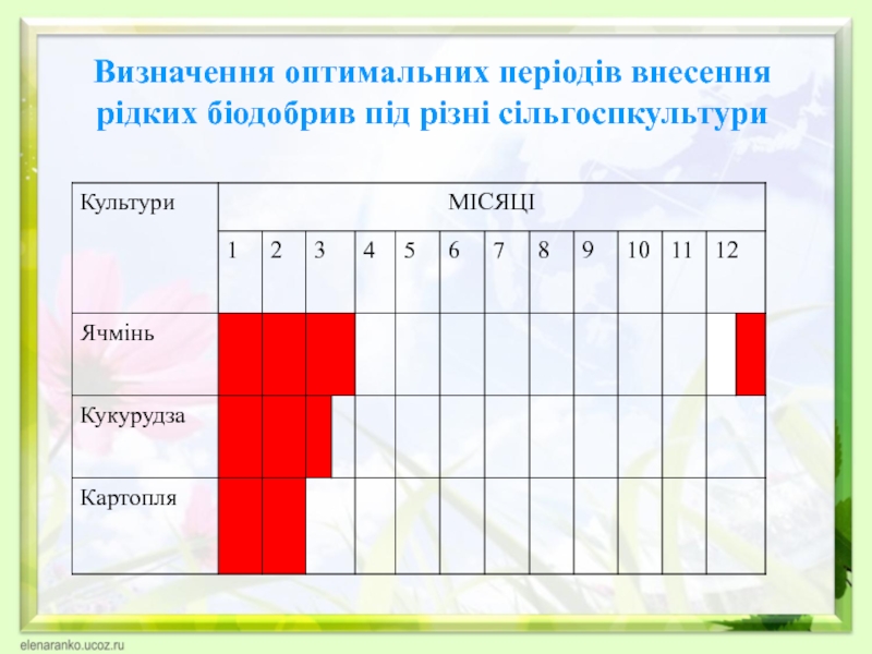 - Визначити оптимальні періоди внесення біодобрив для різних сільськогосподарських культур.
