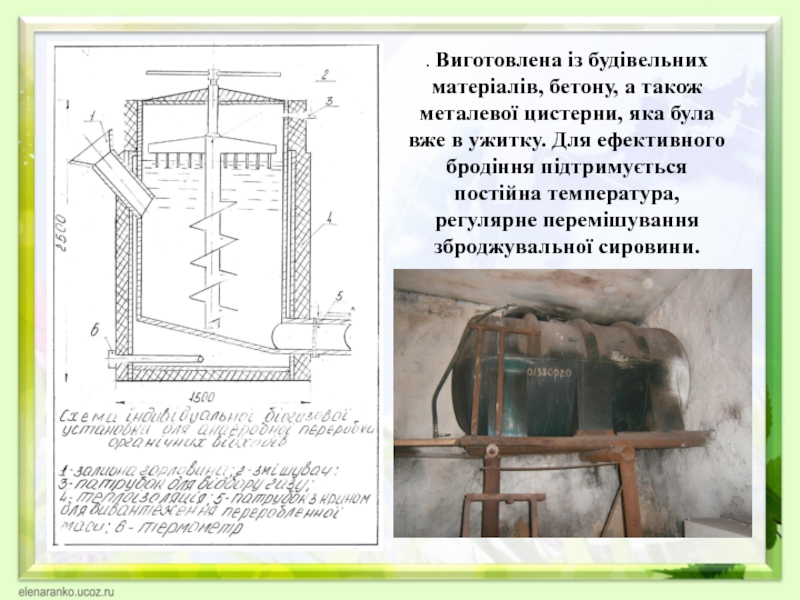 Перемішування сировини для ефективної роботи біогазової установки. ( Рекомендоване перемішування до 6 разів на добу ). Головні цілі перемішування – вивільнення виробленого біогазу, запобігання утворення кірки та осаду та ділянок різної температури в середині реактора, забезпечення рівномірного розподілу популяції бактерій ).