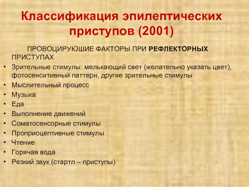 Слайд 25 Эпилептические приступы, возникающие только при действии провоцирующих факторов, названы острыми симптоматическими