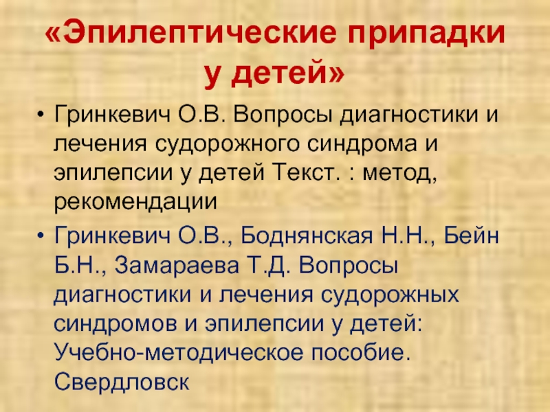 Гринкевич О.В., Боднянская Н.Н., Бейн Б.Н., Замараева Т.Д. Вопросы диагностики и лечения судорожных синдромов и эпилепсии у детей: Учебно-методическое пособие. Свердловск
