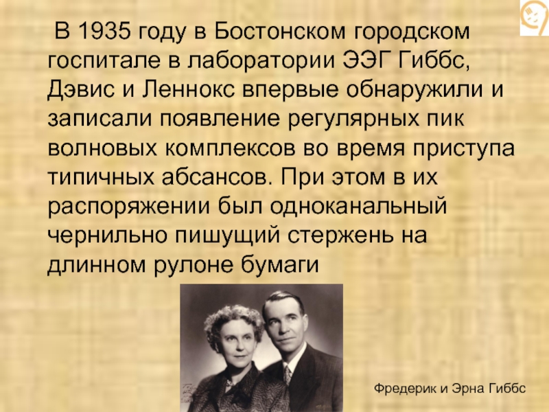 Слайд 32 В 1935 году в Бостонском городском госпитале в лаборатории ЭЭГ Гиббс,