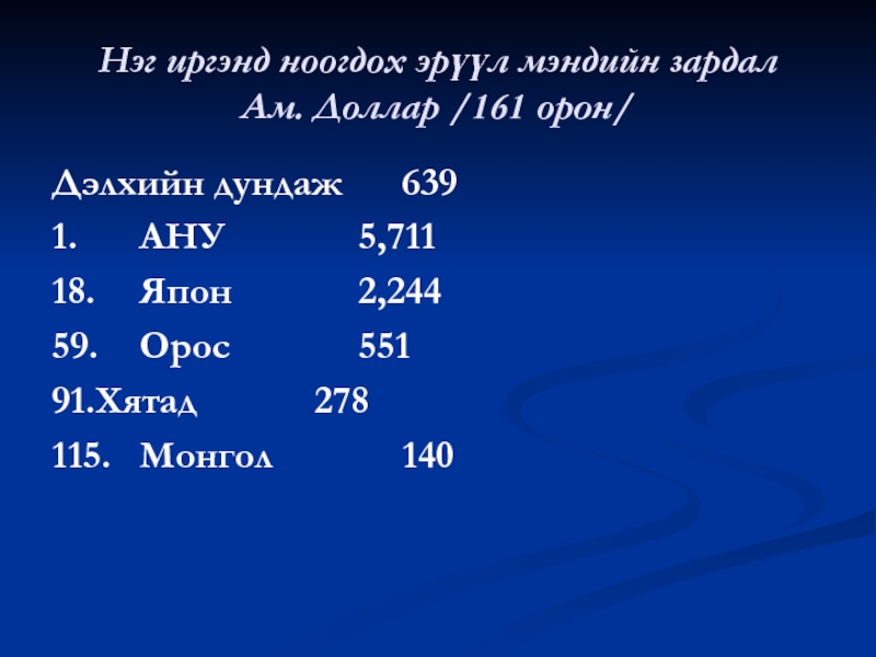 Слайд 5Нэг иргэнд ноогдох эрүүл мэндийн зардал