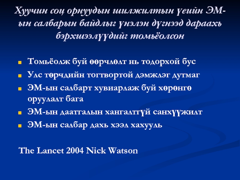 Слайд 21Хуучин соц орнуудын шилжилтын үеийн ЭМ-ын салбарын байдлыг үнэлэн дүгнээд дараахь