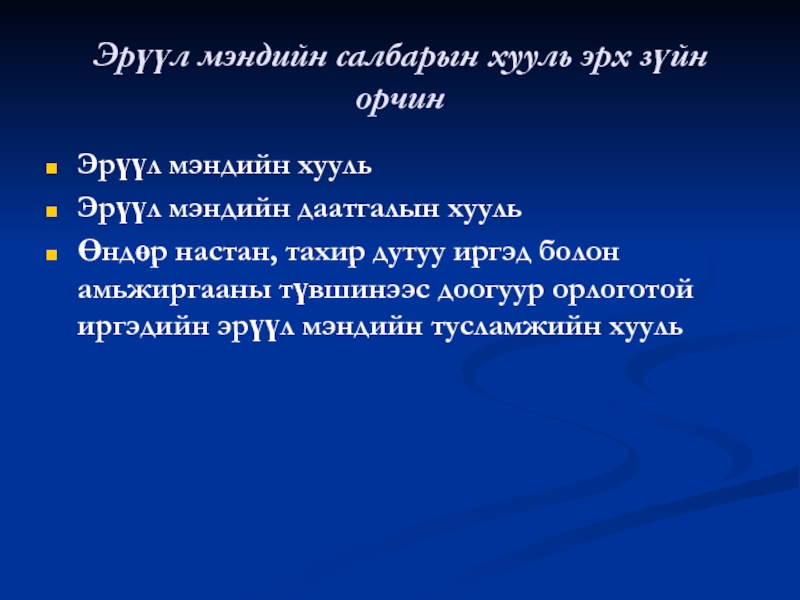 Слайд 14Эрүүл мэндийн салбарын хууль эрх зүйн орчин