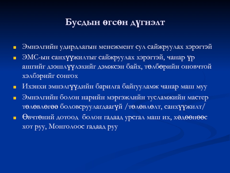 Эмнэлгийн удирдлагын менежмент сул сайжруулах хэрэгтэй