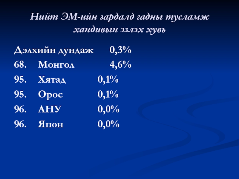 Слайд 8Нийт ЭМ-ийн зардалд гадны тусламж хандивын эзлэх хувь