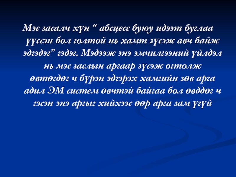 Слайд 23Мэс засалч хүн “ абсцесс буюу идээт буглаа үүссэн бол голтой