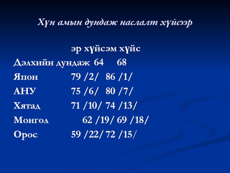 Слайд 2Хүн амын дундаж наслалт хүйсээр