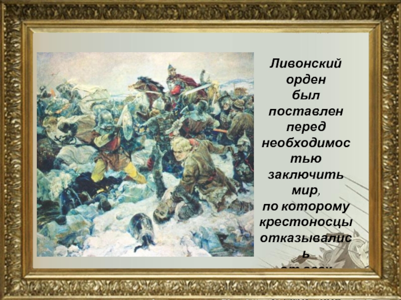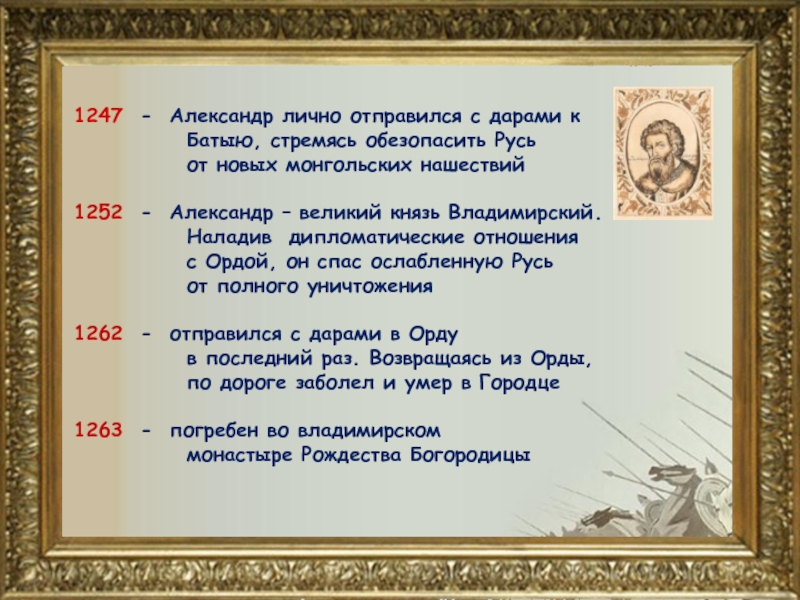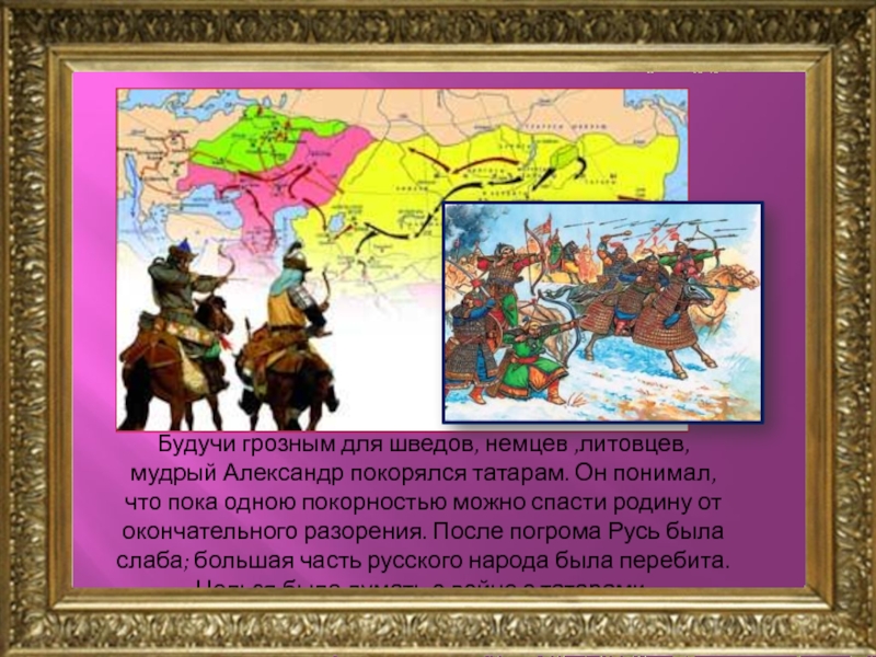 Слайд 26Будучи грозным для шведов, немцев ,литовцев, мудрый Александр покорялся татарам. Он